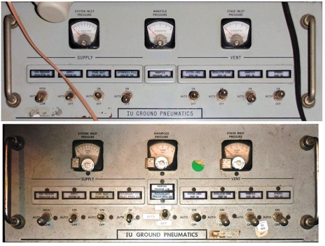At right is the same console during the Apollo 8 CDDT. Note that the panel has been moved up in the console and that an OIS (intercom) panel has been added to the console at bottom. It also appears that some of the colored dots next to switches and indicators have been removed. The dots were color-coded as a quick visual cue as to whether the indicator or switch referred to a system on the flight hardware or the ground support equipment.